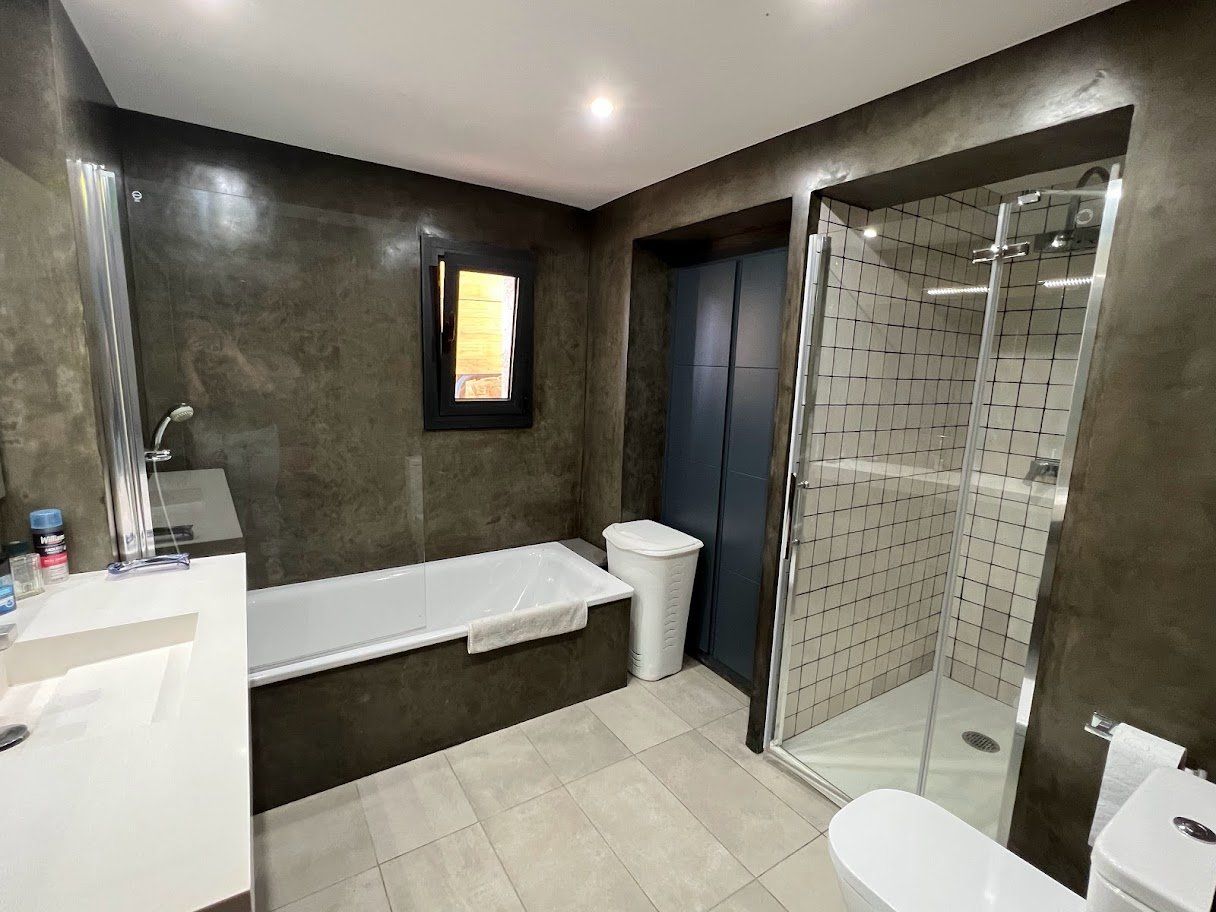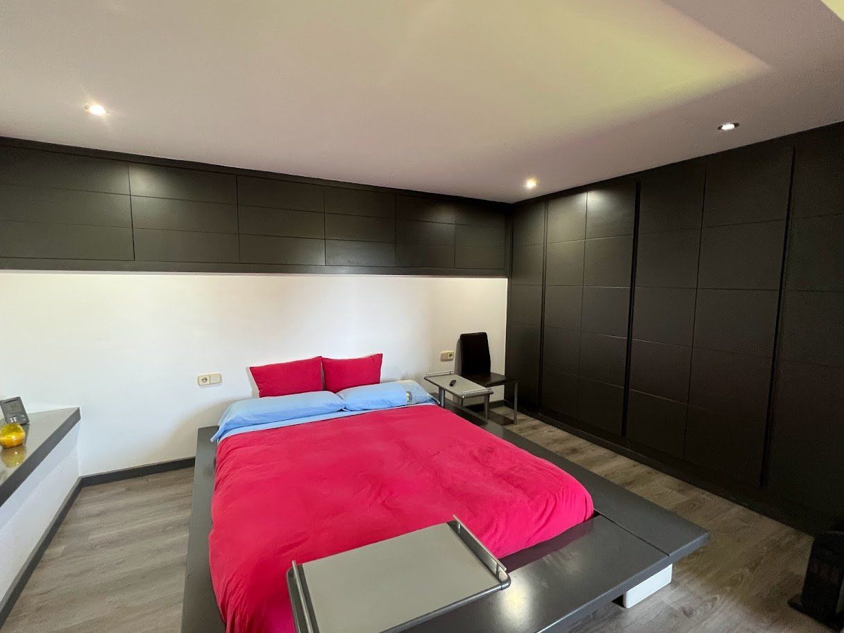 A la planta inferior hi ha un gran dormitori amb armaris de paret i una cambra de bany amb dutxa i banyera, una petita zona de despatx i l'accés al jardí, la terrassa amb vistes a la muntanya i la piscina privada.