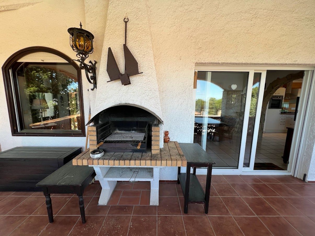 Eine Treppe führt in die Hauptetage, wo sich ein Wohn-Esszimmer mit Kamin, eine voll ausgestattete offene Küche, zwei Doppelschlafzimmer mit Einbauschränken und ein Badezimmer mit Dusche befinden. Vom Wohn-Esszimmer aus haben Sie direkten Zugang zu einer teilweise überdachten Terrasse mit Grill.