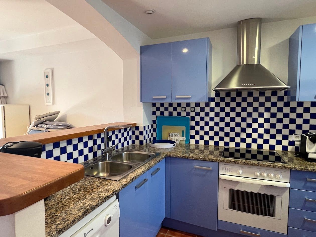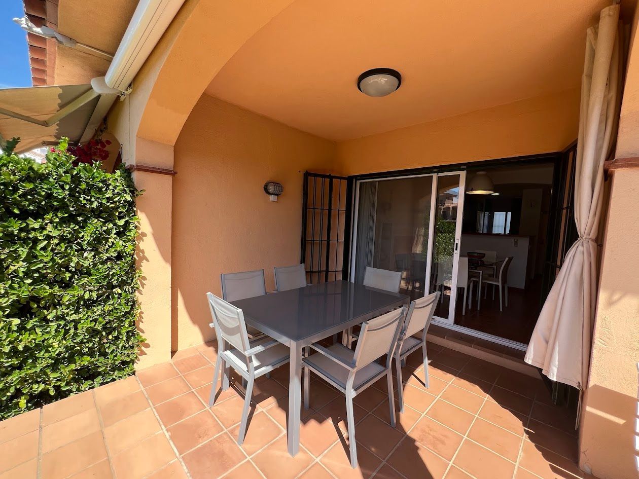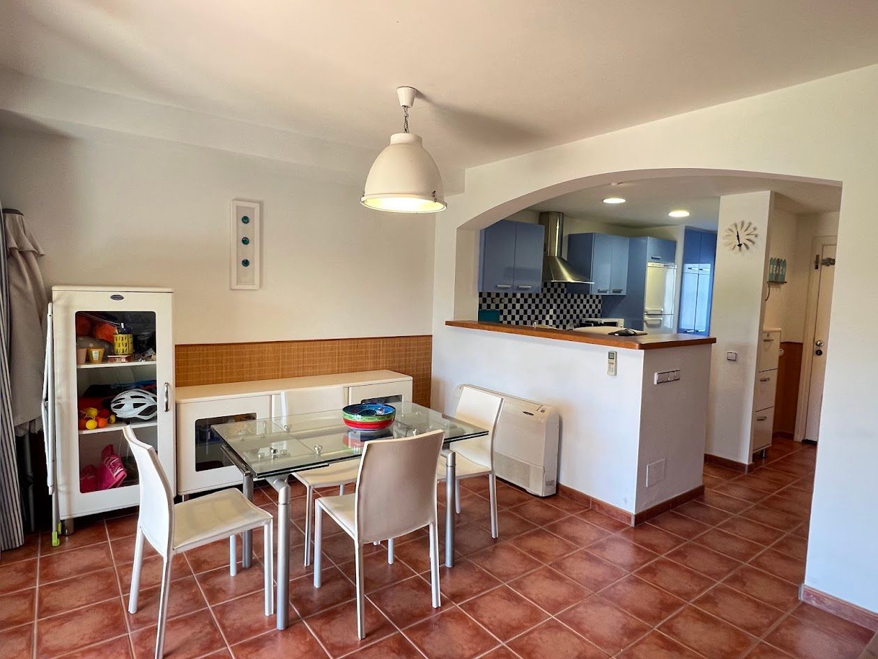 Auf der Eingangsebene befindet sich ein ein Abstellraum, Eingangsvorplatz, die offene voll ausgestattete Küche, ein Gäste-WC und ein helles Wohn - Esszimmer mit Zugang zu einer herrlichen Veranda mit privatem Garten und Zugang zum Gemeinschaftspool. Klimaanlage und Elektrische Rollläden.