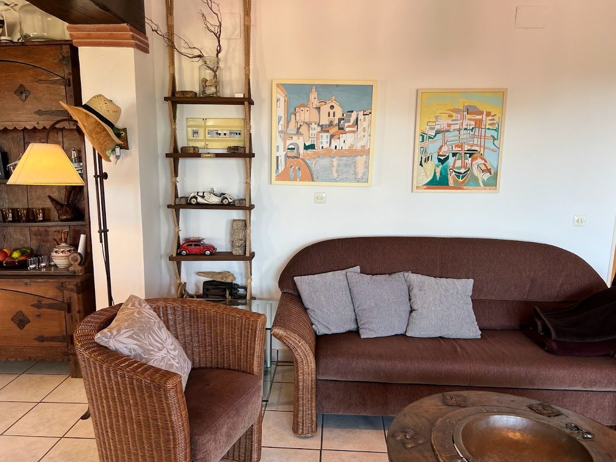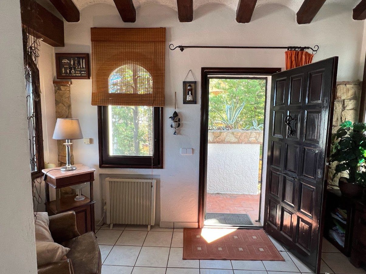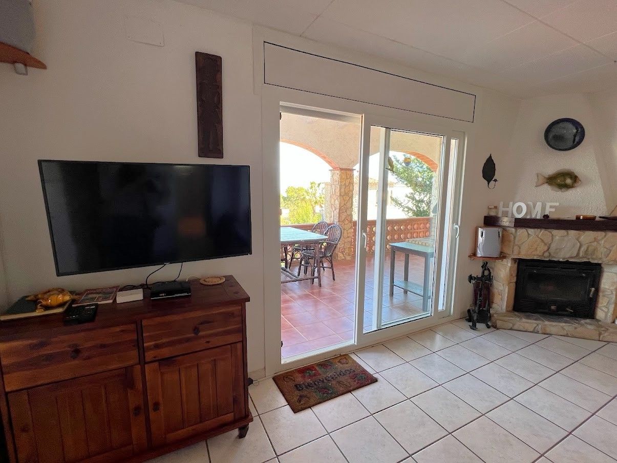 Un escalier mène à l'étage principal, où se trouvent un salon-salle à manger avec cheminée, une cuisine ouverte entièrement équipée, deux chambres doubles avec placards intégrés et une salle de bain avec douche. Depuis le salon - salle à manger vous avez un accès direct à une terrasse partiellement couverte avec barbecue.
